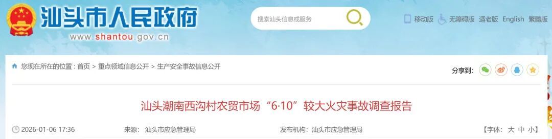 经调查分析认定:汕头潮南西沟村农贸市场“6·10”较大火灾事故是一起较大生产安全责任事故。
